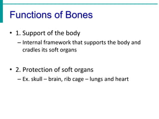 To offer a framework that supports body structures and gives shape to the body. Responsible for supporting the body protecting soft organs providing a place for skeletal muscles to attach storing minerals. Web Chapter 5 The Skeletal System.